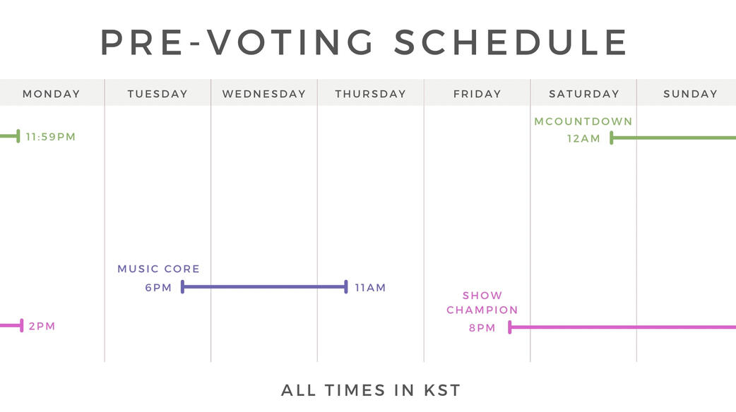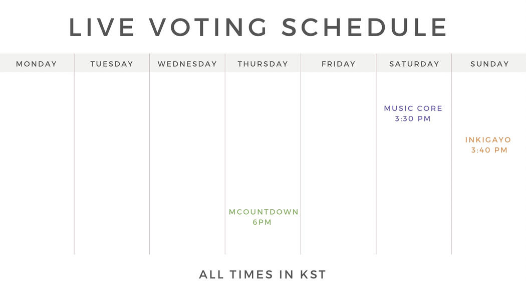 Music CoreApp: MubeatUnlimited accounts per devicePre-voting Tuesday (6pm KST) to Thursday (11am KST). Collect as many Beats as possible (3 beats per vote). Pre-voting is unlimited.Live voting: Opens during live broadcast (Saturdays 3:30pm KST). Save 150 beats for live voting. Purchase live voting tickets in the store under the live voting tab. Maximum of 5 live voting tickets can be used per broadcast. Live voting tickets expire 30 days after purchase.How to collect beats: